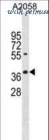 AVEN Antibody western blot of A2058 cell line lysates (35 ug/lane). The AVEN antibody detected the AVEN protein (arrow).