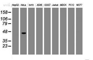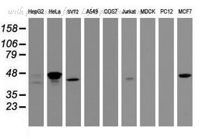 Western blot of extracts (35 ug) from 9 different cell lines by using anti-CBX8 monoclonal antibody (HepG2: human; HeLa: human; SVT2: mouse; A549: human; COS7: monkey; Jurkat: human; MDCK: canine; PC12: rat; MCF7: human).