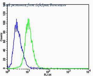 Flow cytometric of A549 cells with CBX8 Antibody (green) compared to an isotype control of mouse IgG1 (blue). Antibody was diluted at 1:25 dilution. An Alexa Fluor 488 goat anti-mouse lgG at 1:400 dilution was used as the secondary antibody.