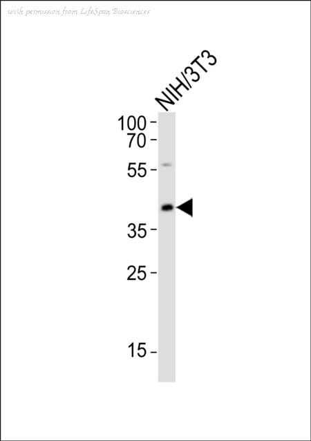 Western blot of lysate from mouse NIH/3T3 cell line with CBX8 Antibody. Antibody was diluted at 1:1000. A goat anti-rabbit IgG H&L (HRP) at 1:10000 dilution was used as the secondary antibody. Lysate at 20 ug.