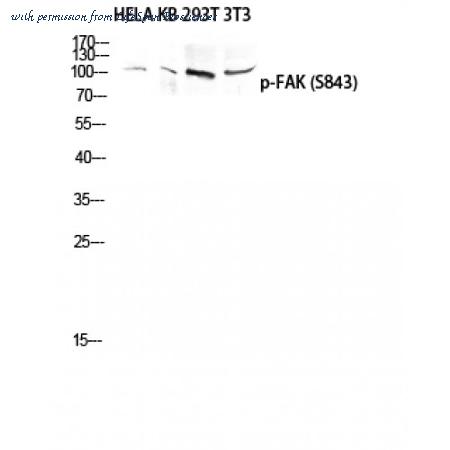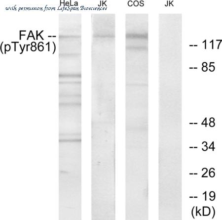 Western blot analysis of lysates from HeLa cells, Jurkat cells and COS cells, using FAK (Phospho-Tyr861) Antibody. The lane on the right is blocked with the phospho peptide.
