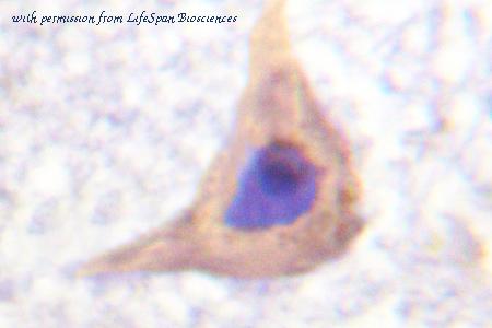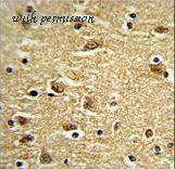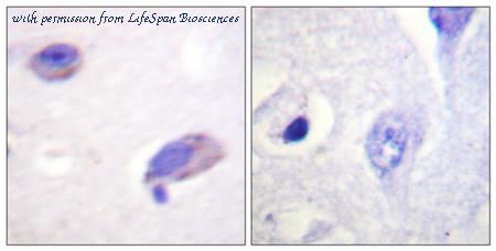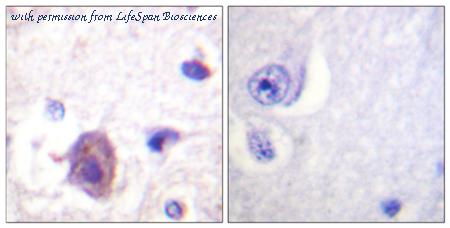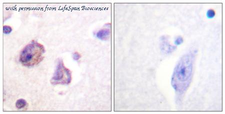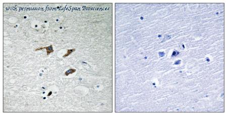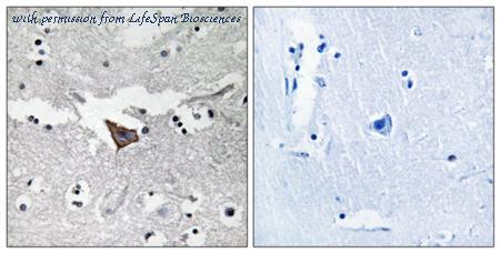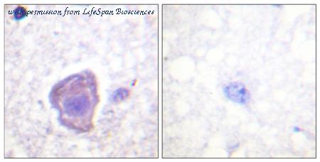 Immunohistochemistry analysis of paraffin-embedded human brain tissue, using FAK Antibody. The picture on the right is blocked with the synthesized peptide.