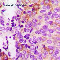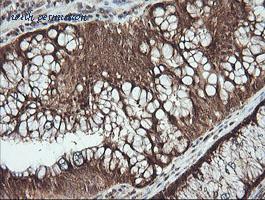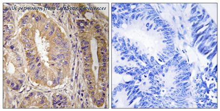Immunohistochemistry analysis of paraffin-embedded human colon carcinoma tissue, using FAK Antibody. The picture on the right is blocked with the synthesized peptide.