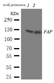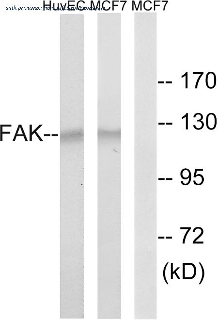 Western blot analysis of lysates from MCF-7 and HUVEC cells, using FAK Antibody. The lane on the right is blocked with the synthesized peptide.