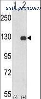 Western blot analysis of lysates from Jurkat cells, treated with CD3 antibody, using FAK Antibody. The lane on the right is blocked with the synthesized peptide.