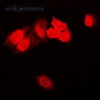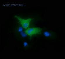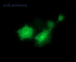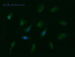 Immunofluorescent staining of HeLa cells using anti-PTK2 mouse monoclonal antibody.