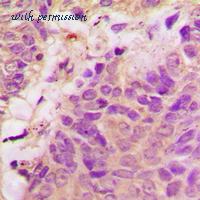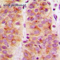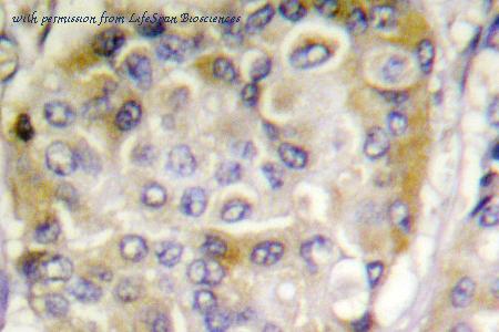 Immunohistochemical analysis of Focal Adhesion Kinase staining in human breast cancer formalin fixed paraffin embedded tissue section. The section was pre-treated using heat mediated antigen retrieval with sodium citrate buffer (pH 6.0). The section was then incubated with the antibody at room temperature and detected with HRP and DAB as chromogen. The section was then counterstained with hematoxylin and mounted with DPX.