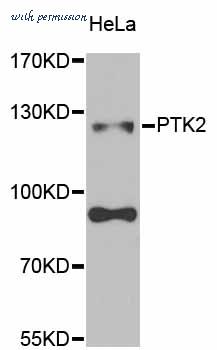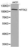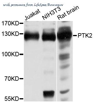 Western blot analysis of extracts of various cell lines, using PTK2 antibody at 1:1000 dilution. The secondary antibody used was an HRP Goat Anti-Rabbit IgG (H+L) at 1:10000 dilution. Lysates were loaded 25ug per lane and 3% nonfat dry milk in TBST was used for blocking. An ECL Kit was used for detection and the exposure time was 30s.