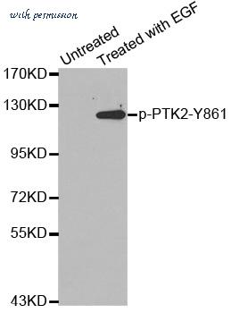 Western blot analysis of lysates from HeLa cells, treated with EGF, using FAK Antibody. The lane on the right is blocked with the synthesized peptide.