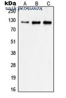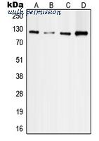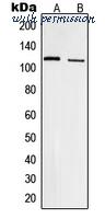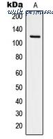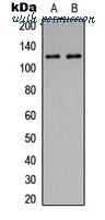Western blot analysis of Focal Adhesion Kinase (pY861) expression in HUVEC (A); HeLa (B) whole cell lysates.