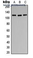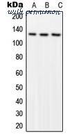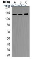 Western blot analysis of Focal Adhesion Kinase expression in HeLa (A); K562 (B); NIH3T3 (C) whole cell lysates.