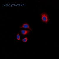 Immunofluorescent analysis of Focal Adhesion Kinase (pY925) staining in NIH3T3 cells. Formalin-fixed cells were permeabilized with 0.1% Triton X-100 in TBS for 5-10 minutes and blocked with 3% BSA-PBS for 30 minutes at room temperature. Cells were probed with the primary antibody in 3% BSA-PBS and incubated overnight at 4 C in a humidified chamber. Cells were washed with PBST and incubated with a DyLight 594-conjugated secondary antibody (red) in PBS at room temperature in the dark. DAPI was used to stain the cell nuclei (blue).