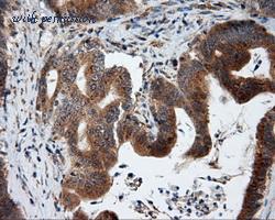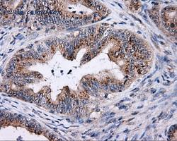 IHC of paraffin-embedded Adenocarcinoma of colon tissue using anti-KIAA1609 mouse monoclonal antibody. (Dilution 1:50).