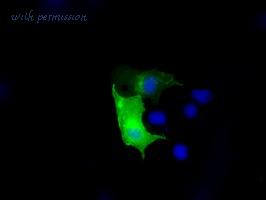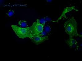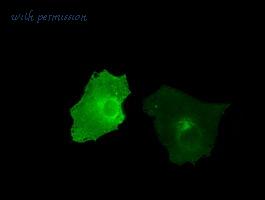 Immunofluorescent staining of HepG2 cells using anti-KIAA1609 mouse monoclonal antibody.