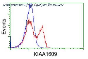 HEK293T cells transfected with either overexpress plasmid (Red) or empty vector control plasmid (Blue) were immunostained by anti-KIAA1609 antibody, and then analyzed by flow cytometry.