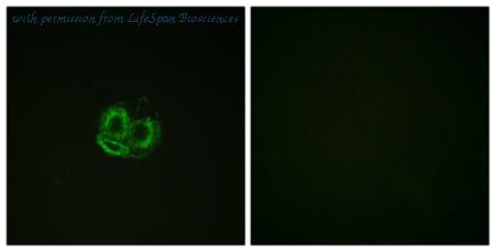 Immunofluorescence analysis of HUVEC cells, using Actin-pan Antibody. The picture on the right is blocked with the synthesized peptide.
