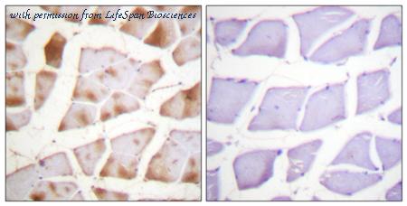 Immunohistochemistry analysis of paraffin-embedded human skeletal muscle tissue, using Actin-pan Antibody. The picture on the right is blocked with the synthesized peptide.