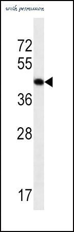 ACTA1 Antibody western blot of CEM cell line lysates (35 ug/lane). The ACTA1 antibody detected the ACTA1 protein (arrow).