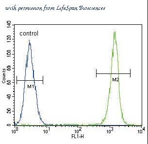 ACTA1 Antibody flow cytometry of A549 cells (right histogram) compared to a negative control cell (left histogram). FITC-conjugated goat-anti-rabbit secondary antibodies were used for the analysis.