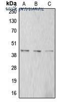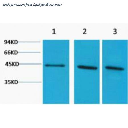 Western blot analysis of Alpha-actin-1 expression in A549 (A); SP2/0 (B); rat kidney (C) whole cell lysates.