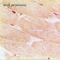 Immunohistochemistry analysis of paraffin-embedded human muscle tissue, using Actin-alpha-1 Antibody. The picture on the right is blocked with the synthesized peptide.