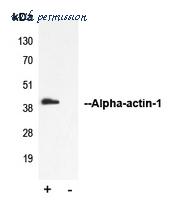 Immunoprecipitation of Alpha-actin-1 from 0.5mg Mouse Skeletal Muscle tissue lysate using 5ug of Anti-Alpha-actin-1 Antibody and 50ul of protein G magnetic beads (+). No antibody was added to the control (-). The antibody was incubated under agitation with Protein G beads for 10min Mouse Skeletal Muscle tissue lysate diluted in RIPA buffer was added to each sample and incubated for a further 10min under agitation. Proteins were eluted by addition of 40ul SDS loading buffer and incubated for 10min at 70 C; 10ul of each sample was separated on a SDS PAGE gel transferred to a nitrocellulose membrane blocked with 5% BSA and probed with Anti-Alpha-actin-1 Antibody.