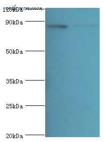 Western blot. All lanes: Glutamine--tRNA ligase antibody at 2 ug/ml. Lane 1: PC-3 whole cell lysate. Lane 2: HeLa whole cell lysate. Secondary antibody: Goat polyclonal to rabbit at 1:10000 dilution. Predicted band size: 88 kDa. Observed band size: 88 kDa Immunohistochemistry.