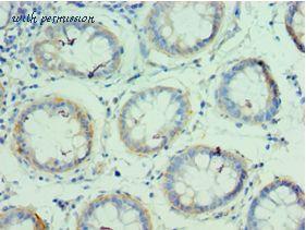 Immunohistochemistry of paraffin-embedded human rectal cancer using antibody at 1:100 dilution.