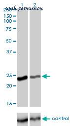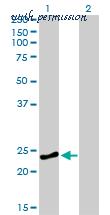Western Blot analysis of RAB4A expression in transfected 293T cell line by RAB4A monoclonal antibody (M01), clone 1C10.Lane 1: RAB4A transfected lysate(24.4 KDa).Lane 2: Non-transfected lysate.