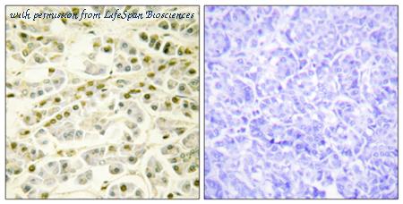 Immunohistochemistry analysis of paraffin-embedded human pancreas tissue, using RAD51L1 Antibody. The picture on the right is blocked with the synthesized peptide.
