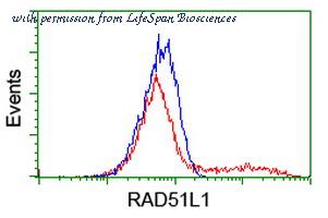 HEK293T cells transfected with either overexpress plasmid (Red) or empty vector control plasmid (Blue) were immunostained by anti-RAD51L1 antibody, and then analyzed by flow cytometry.