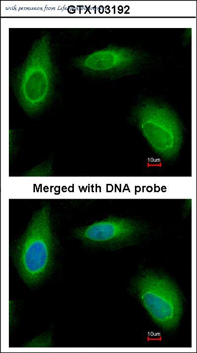 Immunofluorescence of paraformaldehyde-fixed HeLa using Ran BP-1 antibody at 1:200 dilution.