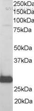 Staining (0.1 ug/ml) of HepG2 lysate (RIPA buffer, 35 ug total protein per lane). Primary incubated for 1 hour. Detected by chemiluminescence.