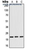 Western blot analysis of RANBP1 expression in HeLa (A); mouse brain (B); rat brain (C) whole cell lysates.