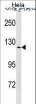 TRPV4 Antibody western blot of HeLa cell line lysates (35 ug/lane). The TRPV4 antibody detected the TRPV4 protein (arrow).