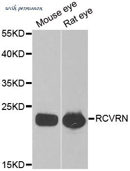 Western blot of lysates from mouse eyeball and rat eyeball tissue lysate (from left to right) with RCVRN Antibody. Antibody was diluted at 1:1000 at each lane. A goat anti-rabbit IgG H&L (HRP) at 1:5000 dilution was used as the secondary antibody. Lysates at 35 ug per lane.