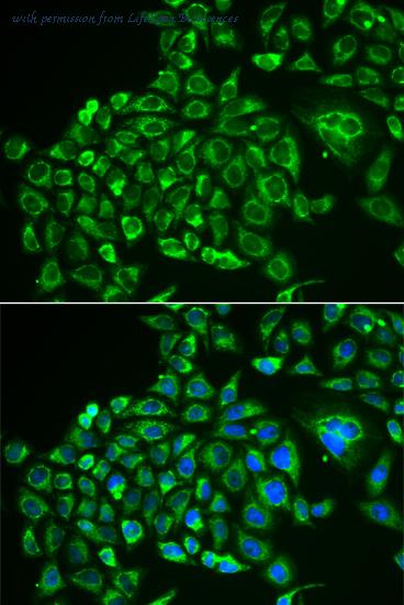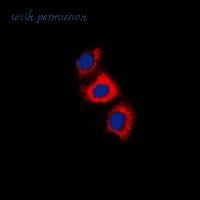 Immunofluorescent analysis of Recoverin staining in HeLa cells. Formalin-fixed cells were permeabilized with 0.1% Triton X-100 in TBS for 5-10 minutes and blocked with 3% BSA-PBS for 30 minutes at room temperature. Cells were probed with the primary antibody in 3% BSA-PBS and incubated overnight at 4 deg C in a humidified chamber. Cells were washed with PBST and incubated with a DyLight 594-conjugated secondary antibody (red) in PBS at room temperature in the dark. DAPI was used to stain the cell nuclei (blue).