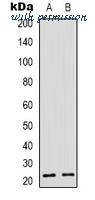 Western blot analysis of Recoverin expression in Y79 (A); NIH3T3 (B) whole cell lysates.
