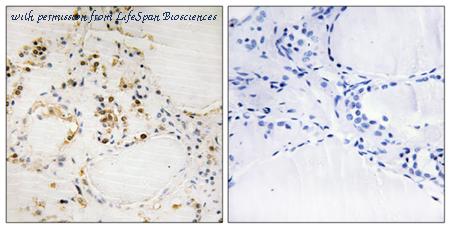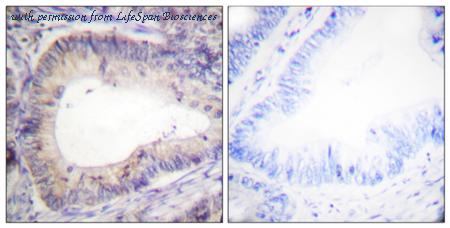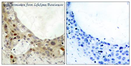 Immunohistochemistry analysis of paraffin-embedded human breast carcinoma, using BCL-2 (Phospho-Thr56) Antibody. The picture on the right is blocked with the phospho peptide.