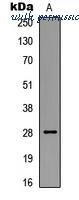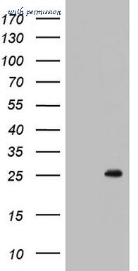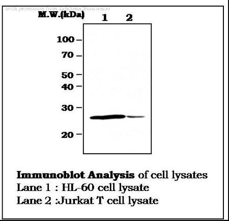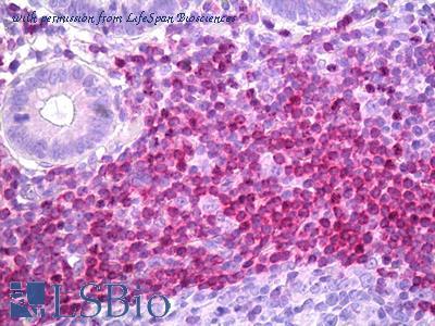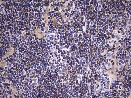 Staining (1 ug/ml) of Human Lymph Node lysate (RIPA buffer, 35 ug total protein per lane). Primary incubated for 1 hour. Detected using chemiluminescence.
