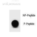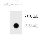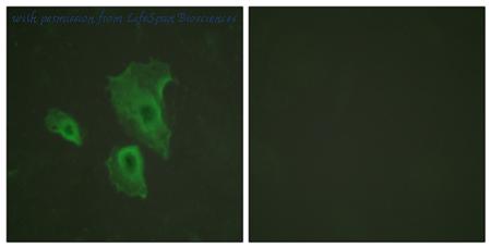 Immunofluorescence analysis of A549 cells, using BCL-2 (Phospho-Thr56) Antibody. The picture on the right is blocked with the phospho peptide.