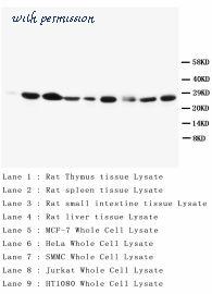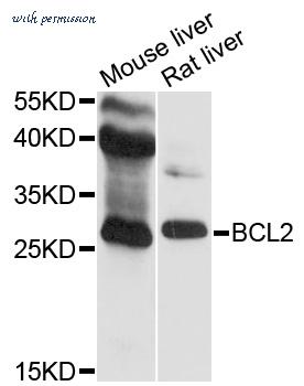 Western blot analysis of BCL2 expression in MCF7 (A); mouse brain (B); rat kidney (C) whole cell lysates.