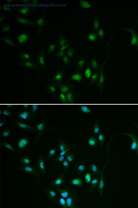 Confocal immunofluorescence of Bcl-2 Antibody (BH3 Domain Specific) with HeLa cell followed by Alexa Fluor 488-conjugated goat anti-rabbit lgG (green). DAPI was used to stain the cell nuclear (blue).