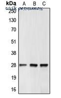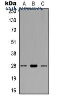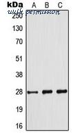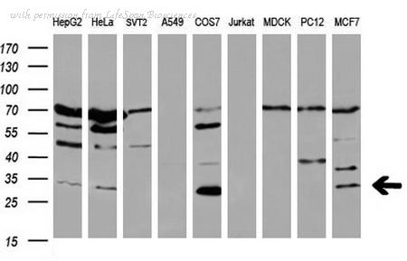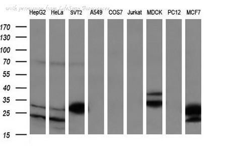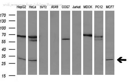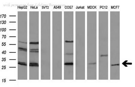 Western blot analysis of BCL2 expression in MCF7 (A); Raw264.7 (B); NIH3T3 (C) whole cell lysates.