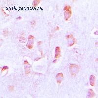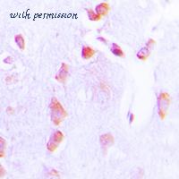 Immunohistochemical analysis of BCL2 (pT69) staining in human brain formalin fixed paraffin embedded tissue section. The section was pre-treated using heat mediated antigen retrieval with sodium citrate buffer (pH 6.0). The section was then incubated with the antibody at room temperature and detected using an HRP conjugated compact polymer system. DAB was used as the chromogen. The section was then counterstained with hematoxylin and mounted with DPX.