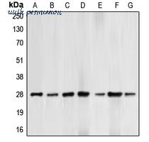 Western blot analysis of BCL2 (pT69) expression in HepG2 UV-treated (A); HeLa (B); HL60 (C); THP1 (D); Jurkat paclitaxel-treated (E); NIH3T3 H2O2-treated (F); PC12 H2O2-treated (G) whole cell lysates.