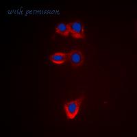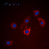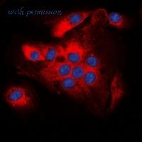 Immunofluorescent analysis of BCL2 (pT56) staining in A549 cells. Formalin-fixed cells were permeabilized with 0.1% Triton X-100 in TBS for 5-10 minutes and blocked with 3% BSA-PBS for 30 minutes at room temperature. Cells were probed with the primary antibody in 3% BSA-PBS and incubated overnight at 4 deg C in a humidified chamber. Cells were washed with PBST and incubated with a DyLight 594-conjugated secondary antibody (red) in PBS at room temperature in the dark. DAPI was used to stain the cell nuclei (blue).