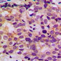 Immunohistochemical analysis of BCL2 (pT56) staining in human lung cancer formalin fixed paraffin embedded tissue section. The section was pre-treated using heat mediated antigen retrieval with sodium citrate buffer (pH 6.0). The section was then incubated with the antibody at room temperature and detected using an HRP polymer system. DAB was used as the chromogen. The section was then counterstained with hematoxylin and mounted with DPX.