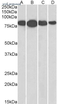 RDX / Radixin antibody (0.01µg/ml) staining of NIH3T3 (A), HeLa (B), Jurkat (C), and A431 (D) lysates (35µg protein in RIPA buffer). Detected by chemiluminescence.
