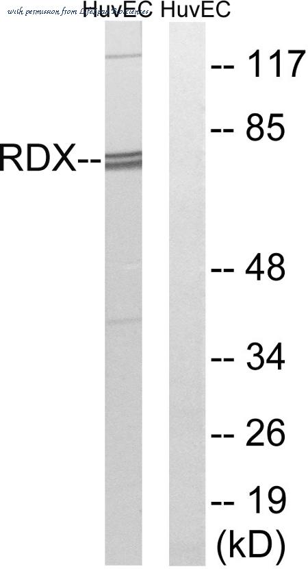 Western blot analysis of lysates from HUVEC cells, using RDX Antibody. The lane on the right is blocked with the synthesized peptide.
